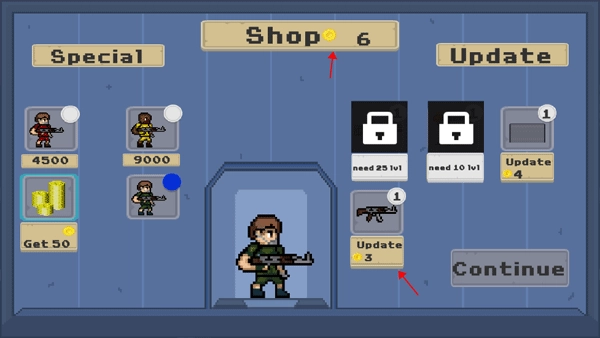 4、当你获得相应的金币之后。就可以点击右上方的“Shop”来购买道具和人物角色,最后点击“Continue”继续射击僵尸。