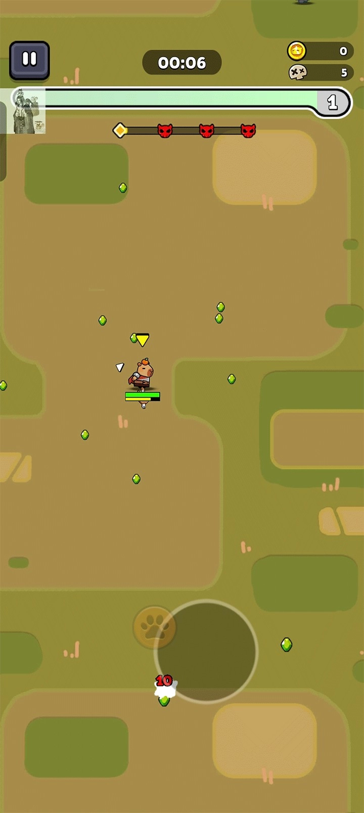 2、操控卡皮巴拉战士在关卡地图中四处探索,击败所有来袭的怪物。